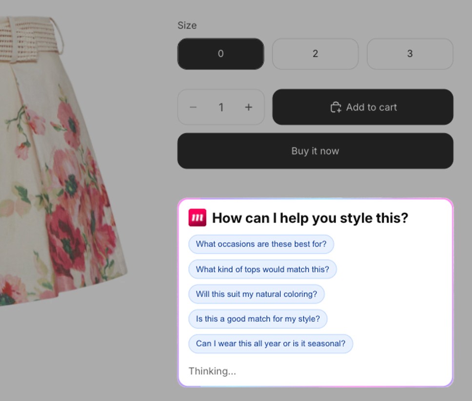 Ask shoppers about fit, style, and color while guiding them to make confident decisions, right on the PDP.
